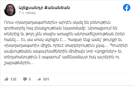 Separatçı Dağlıq Qarabağ “prezidentinin köməkçisi” David Babayan deyib ku, Kanayanın bəyanatları həqiqət deyil və Rusiya sülhməramlıları hazırda Kəlbəcərdə deyil.