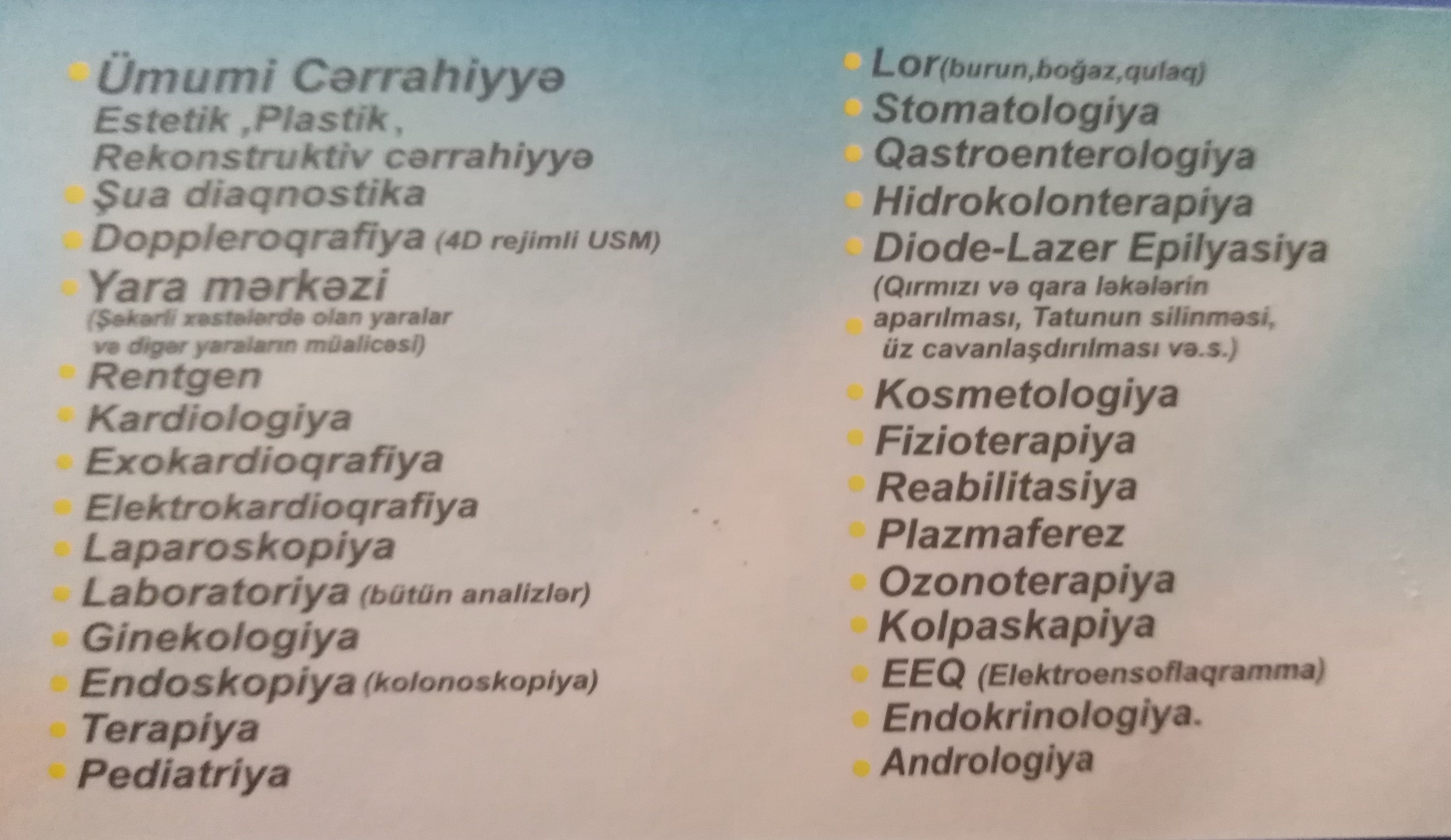 Androloji, uroloji, kasmetoloji endokrinoloji, labarator ginekoloji, kardioloji psixoteropevtik, terapevtik, nevropatoloji, fizioterapevtiv müalicə, plazmofarez