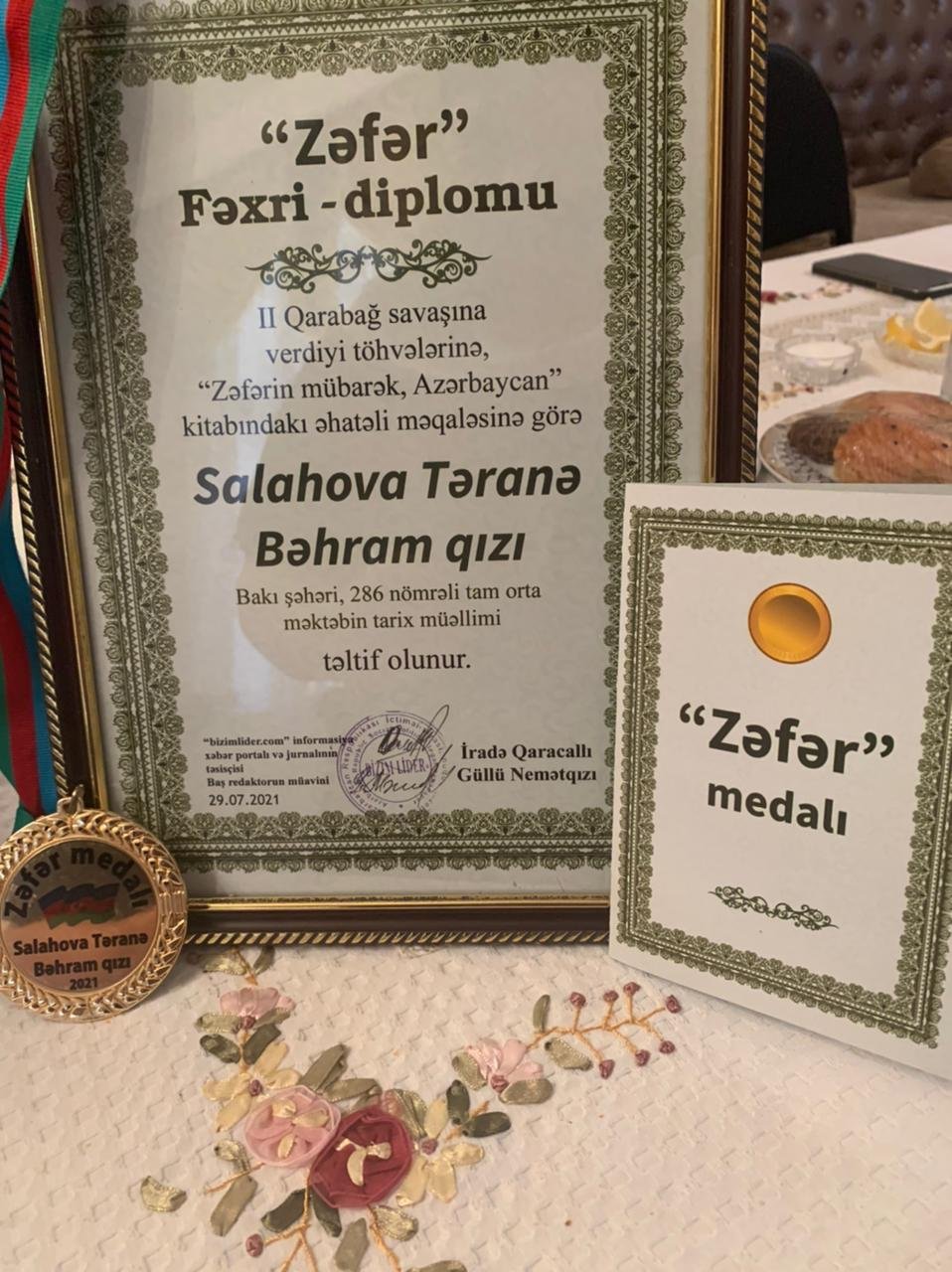Redaksiyamız tərəfindən kecirilən rəy sorgusuna əsasən, dövlətə və dövlətçiliyə göstərdiyi xidmətlərə, II Qarabağ savaşına verdiyi töhvələrinə, "Zəfərin Mübarək Azərbaycan" kitabındakı məqaləsinə görə Bakı şəhəri, 286 nömrəli tam orta məktəbin tarix müəllimi Salahova Təranə Bəhram qızı "Zəfər" DİPLOMUNA VƏ MEDALINA layiq görülüb. Bu münasibətlə onu təbrik edir, ona işlərində uğurlar arzu edirik.