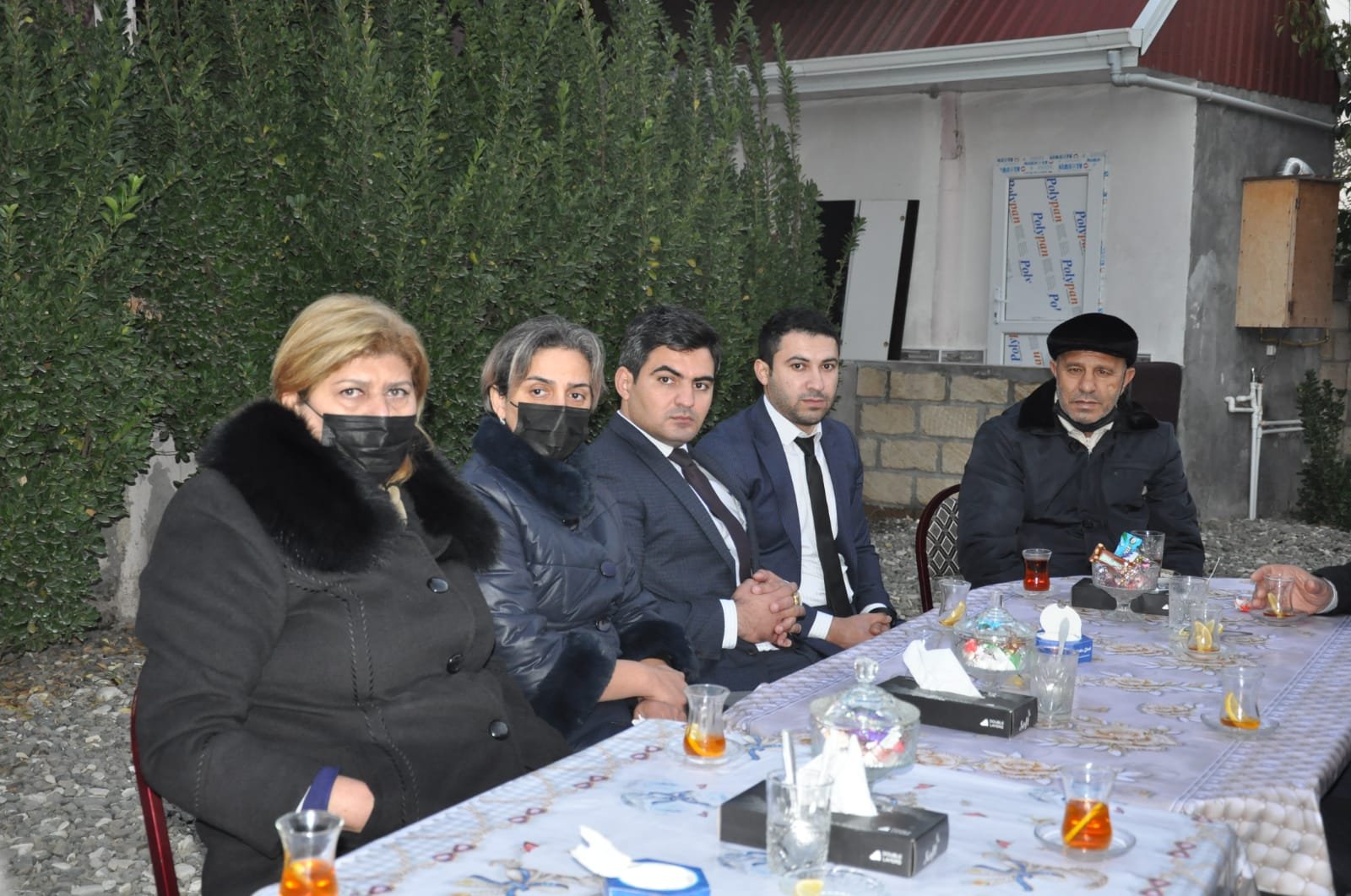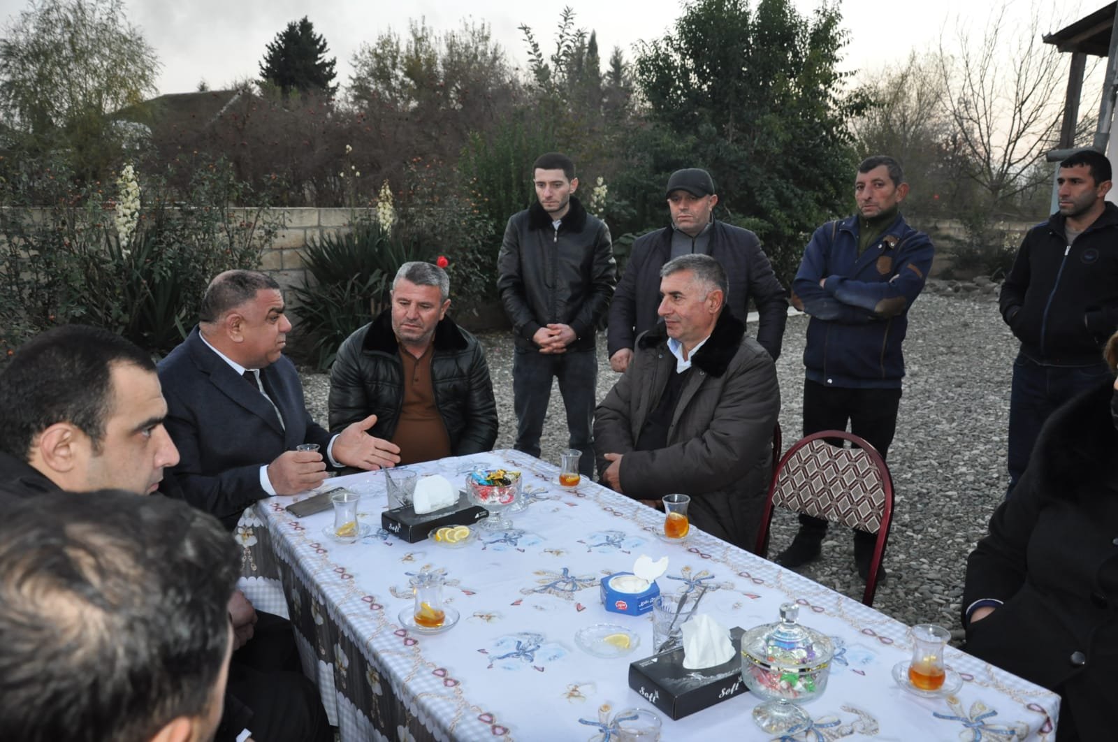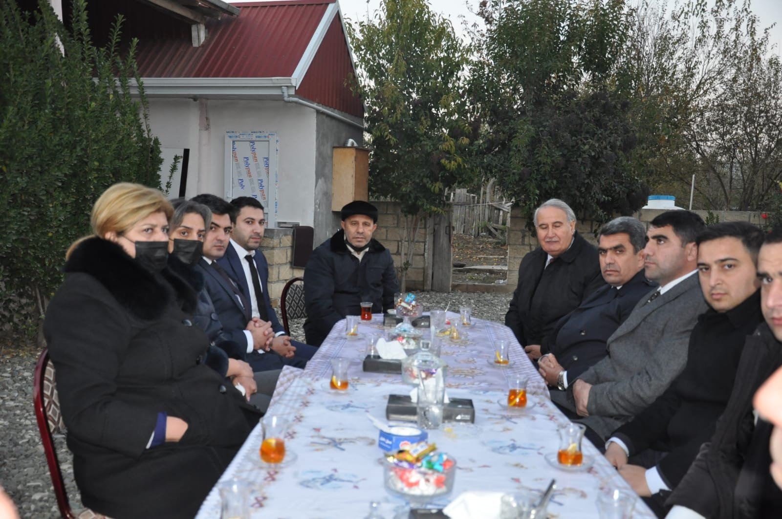 Daha sonra ziyarətçilər şəhid Azad Tapdıqovun evində olmuş, çay süfrəsi arxasında söhbət etmişlər. Şəhidin atası Azad Tapdıqov Yeni Azərbaycan Partiyasının yaranmasının ildönümü ərəfəsində ölkənin aparıcı siyasi qüvvəsi olan partiyanın üzvü olmuş şəhid oğlunun ailəsini ziyarət etdiyi üçün öz minnətdarlığını bildirmişdir.