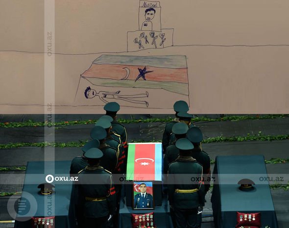 Dövlət Sərhəd Xidmətinin helikopterinin noyabrın 30-da Qaraheybət aviasiya poliqonunda təlim zamanı qəzaya uğraması nəticəsində həlak olan hərbçilərdən mayor Murad Məmmədovun qızı vida mərasimindən sonra təəssüratlarını rəsm çəkməklə ifadə edib.