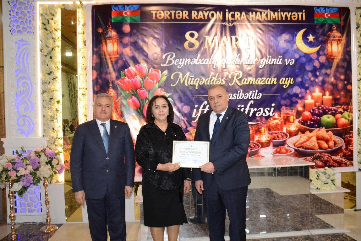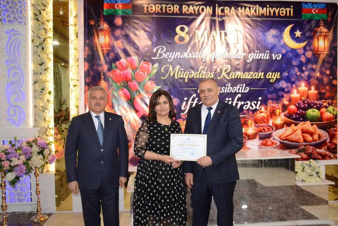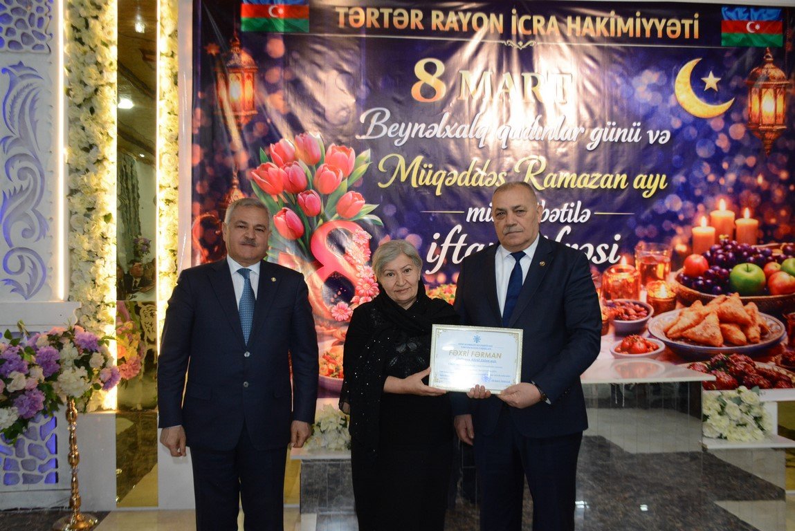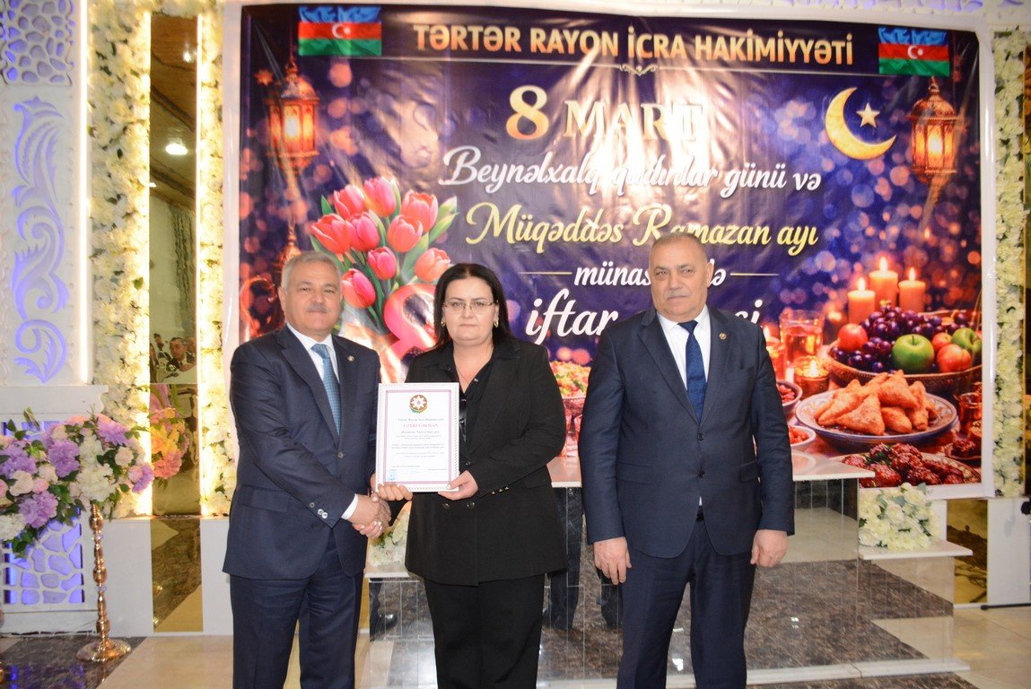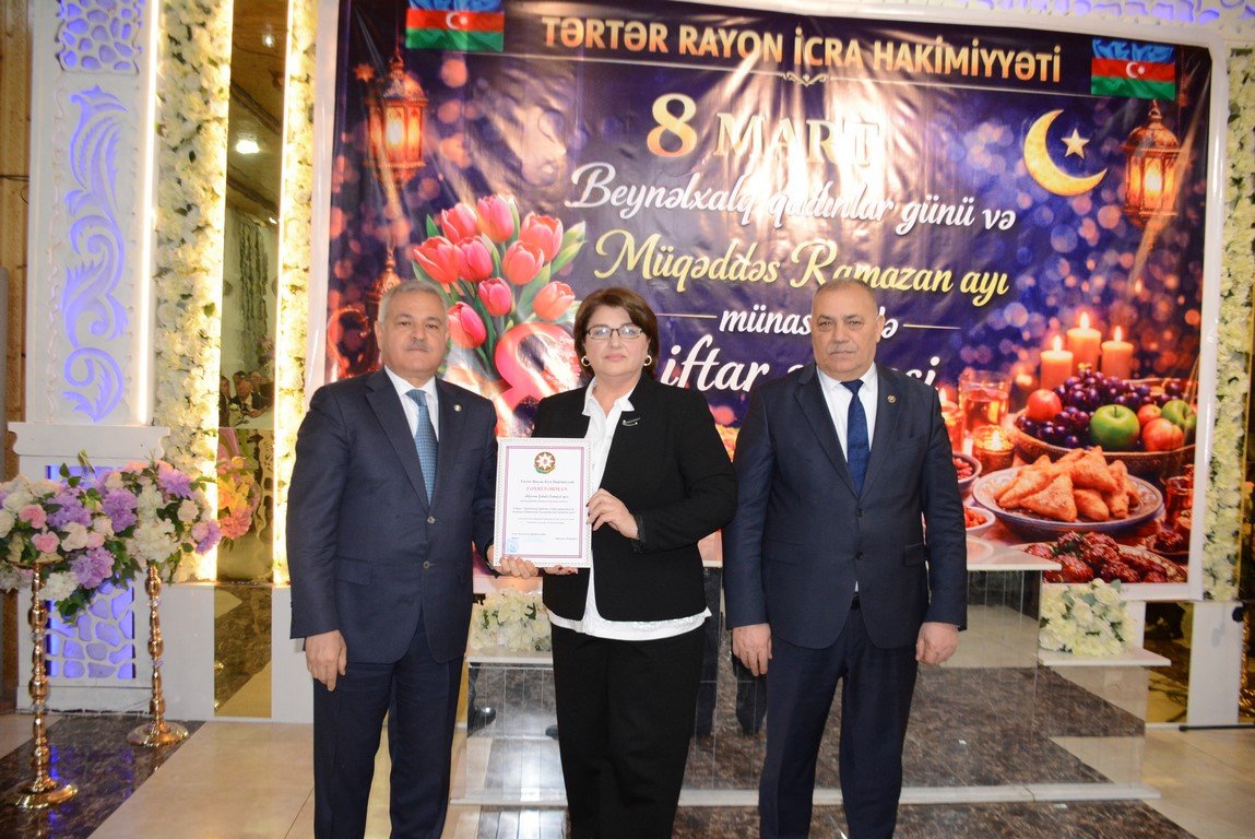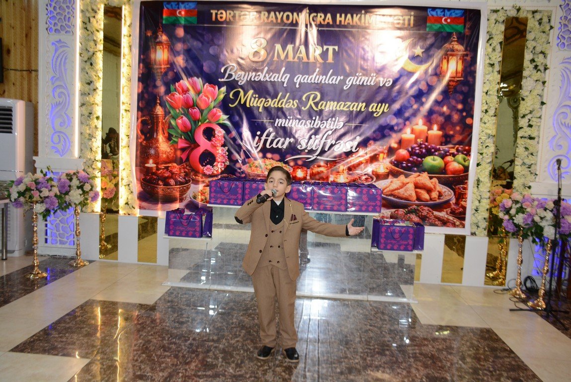 Tərtər Rayon İcra Hakimiyyətinin və YAP Tərtər rayon təşkilatının birgə təşkilatçılığı ilə “Tərtər İstirahət Mərkəzi”ndə 8 Mart – Beynəlxalq Qadınlar Günü münasibətilə tədbir keçirilib. Bayramın müqəddəs Ramazan ayına təsadüf etməsi münasibətilə tədbir iftar süfrəsi ətrafında təşkil olunub.