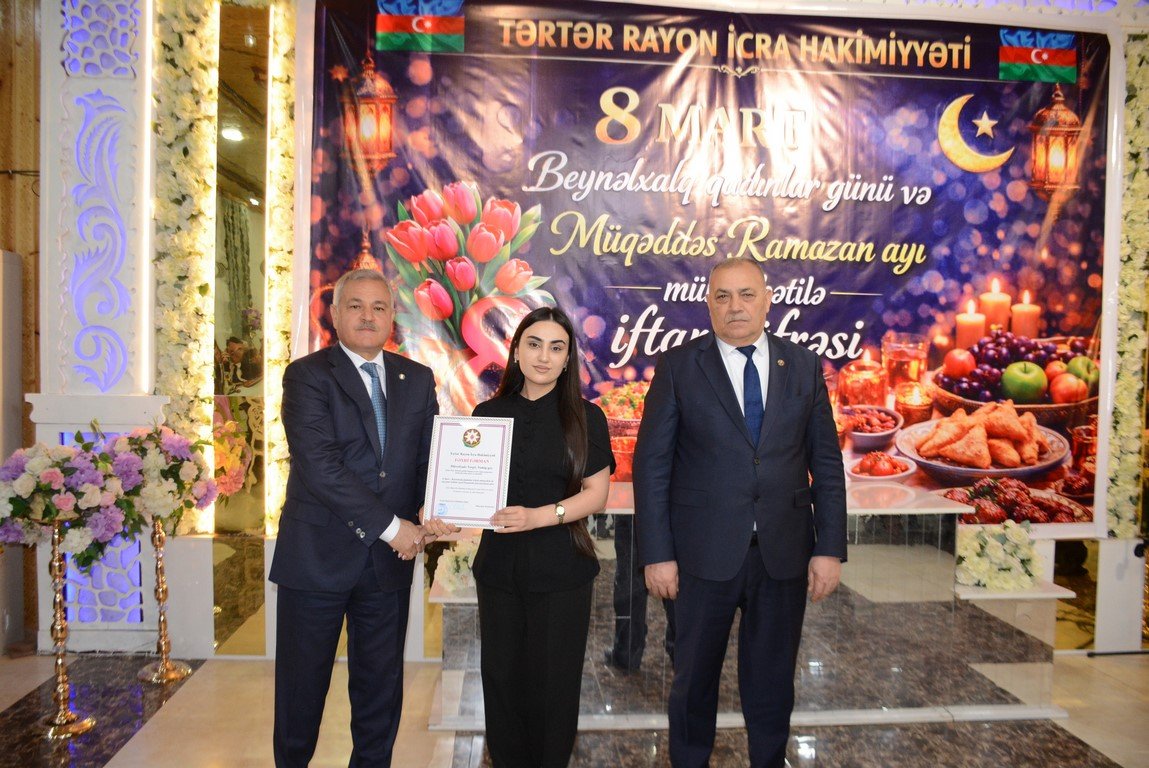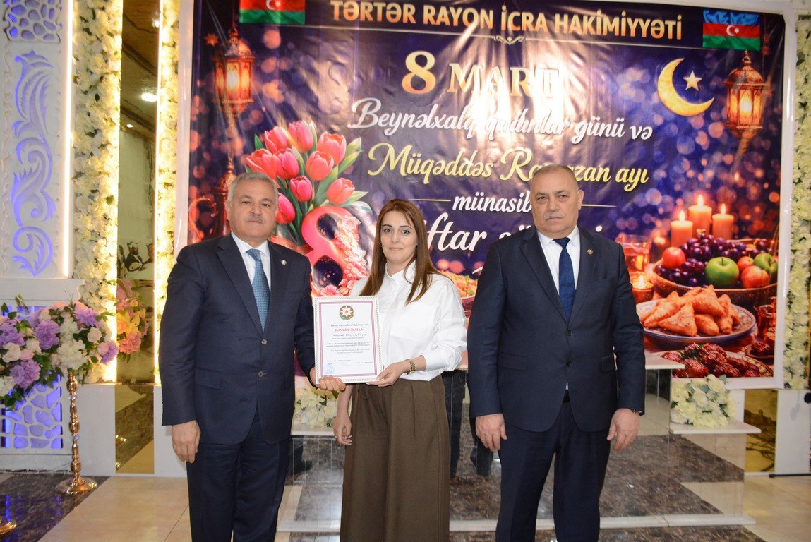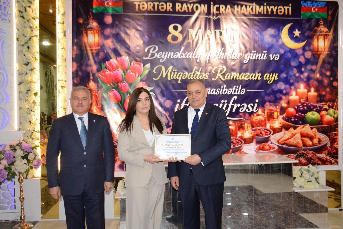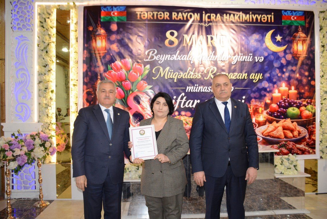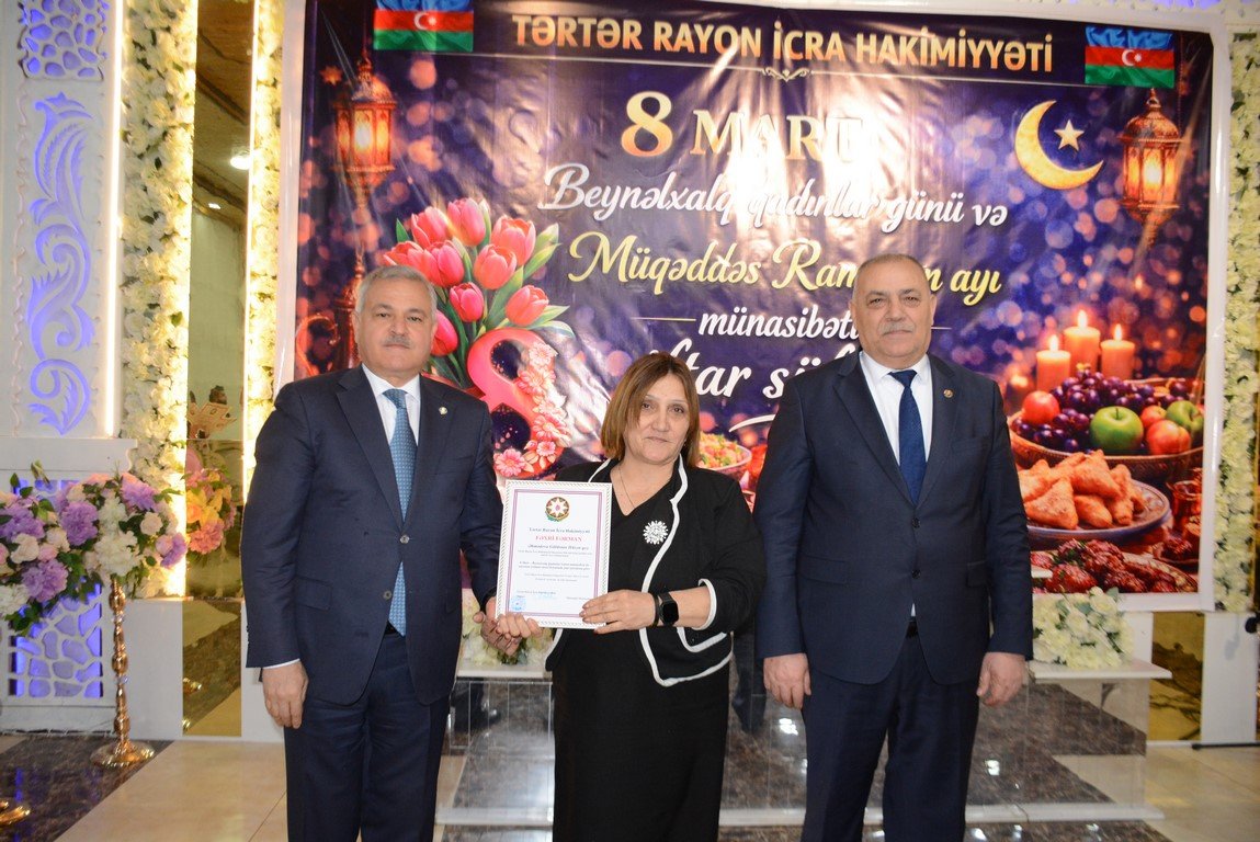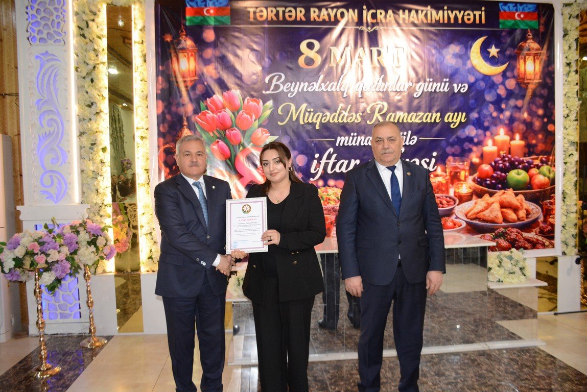 Tərtər Rayon İcra Hakimiyyətinin və YAP Tərtər rayon təşkilatının birgə təşkilatçılığı ilə “Tərtər İstirahət Mərkəzi”ndə 8 Mart – Beynəlxalq Qadınlar Günü münasibətilə tədbir keçirilib. Bayramın müqəddəs Ramazan ayına təsadüf etməsi münasibətilə tədbir iftar süfrəsi ətrafında təşkil olunub.