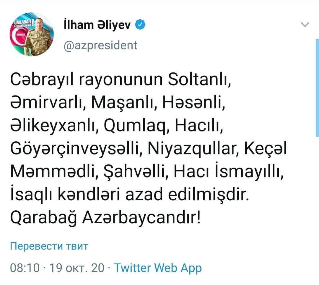 Azərbaycan Prezidenti Cəbrayıl rayonunun işğaldan azad olunmuş doqquz kəndinin adını açıqlayıb